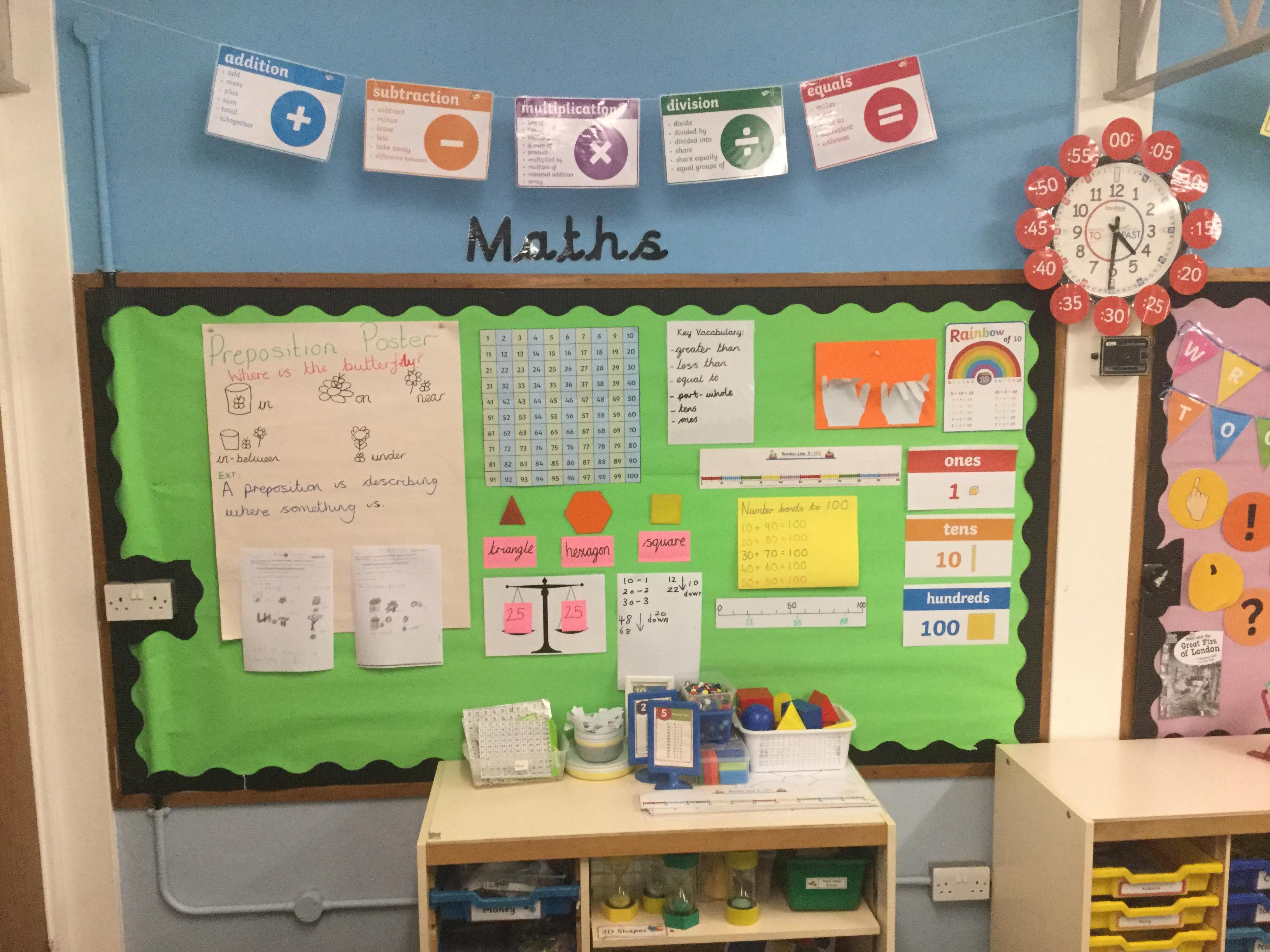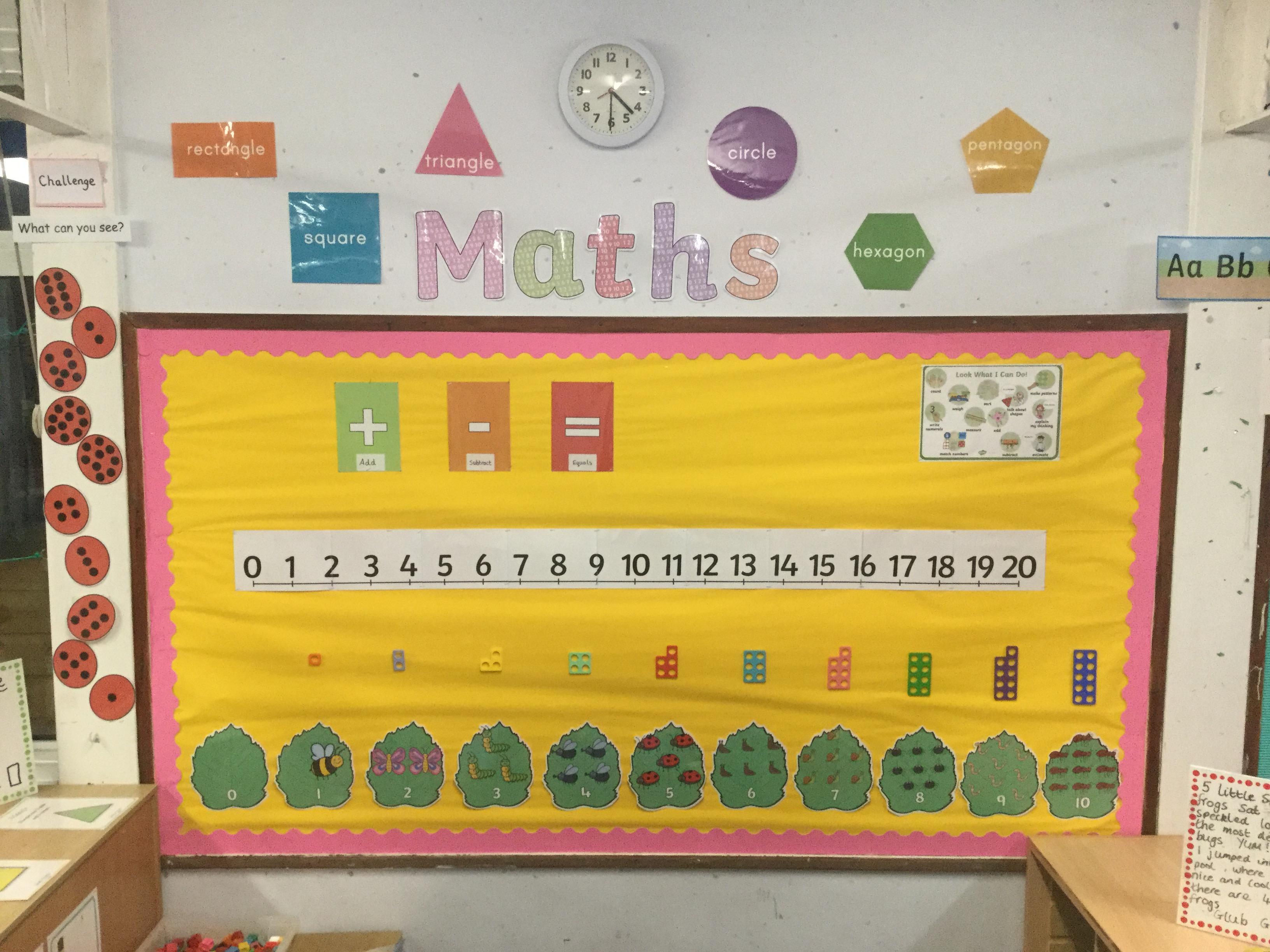 In Nursery, the pupils have been learning to recognise and name 2D shapes and are beginning to recognise and represent numbers. They are also beginning to create graphs using pictures and have been learning to use Unifix to measure their feet.