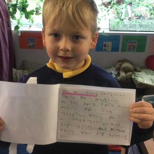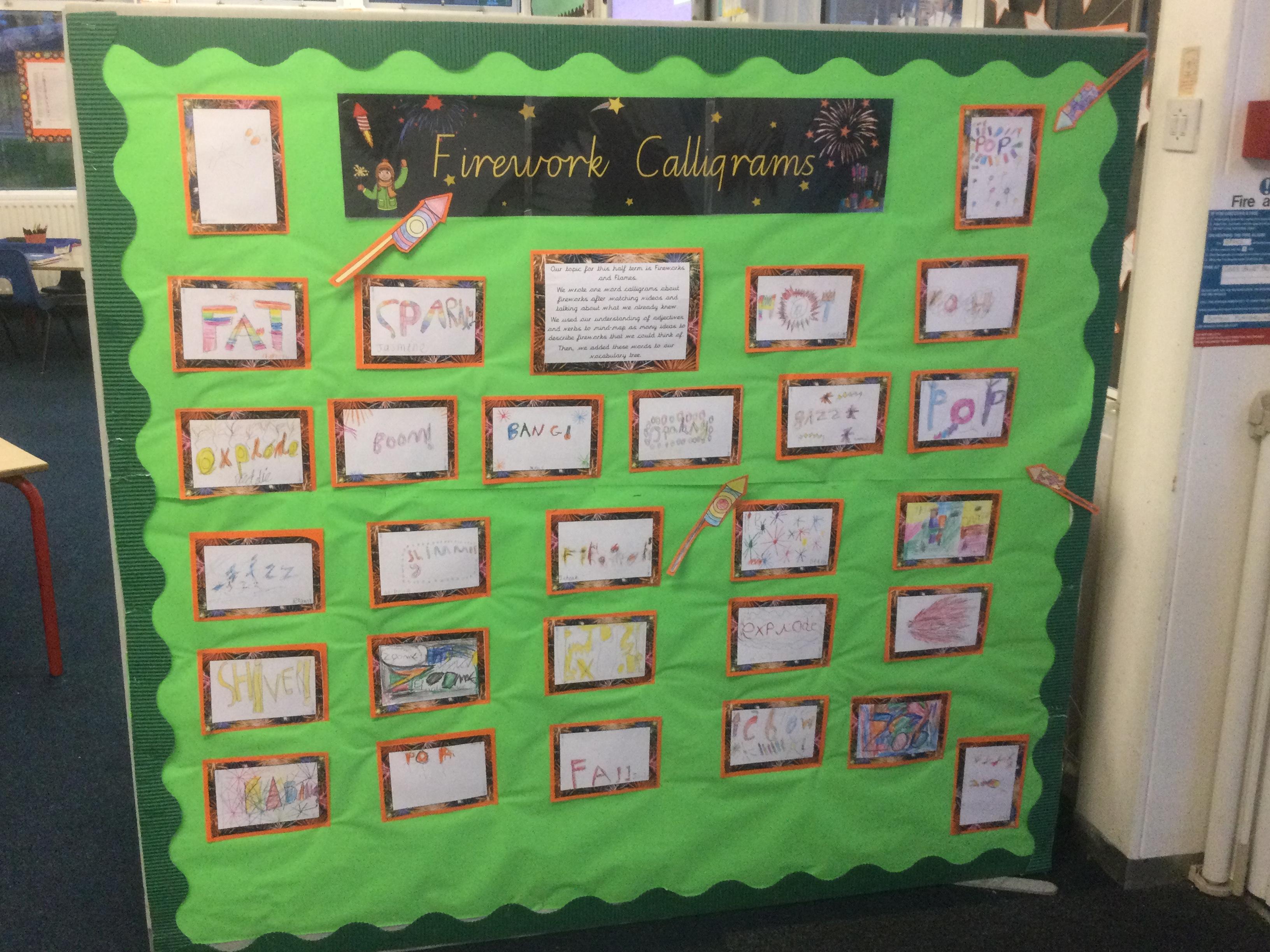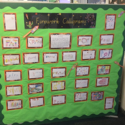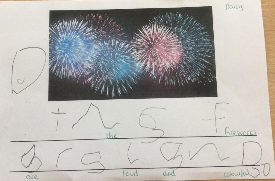 In Reception class, some of the pupils chose to write about fireworks and bonfire night. They applied some of the skills that they had learnt in phonics lessons to their independent writing.