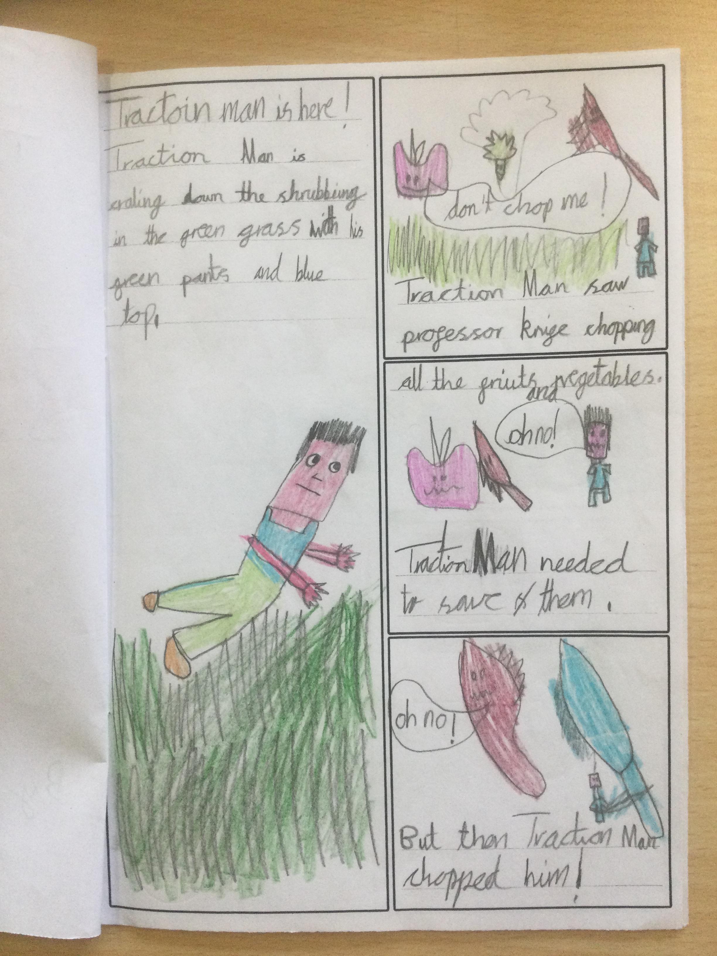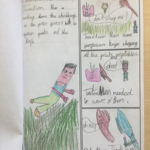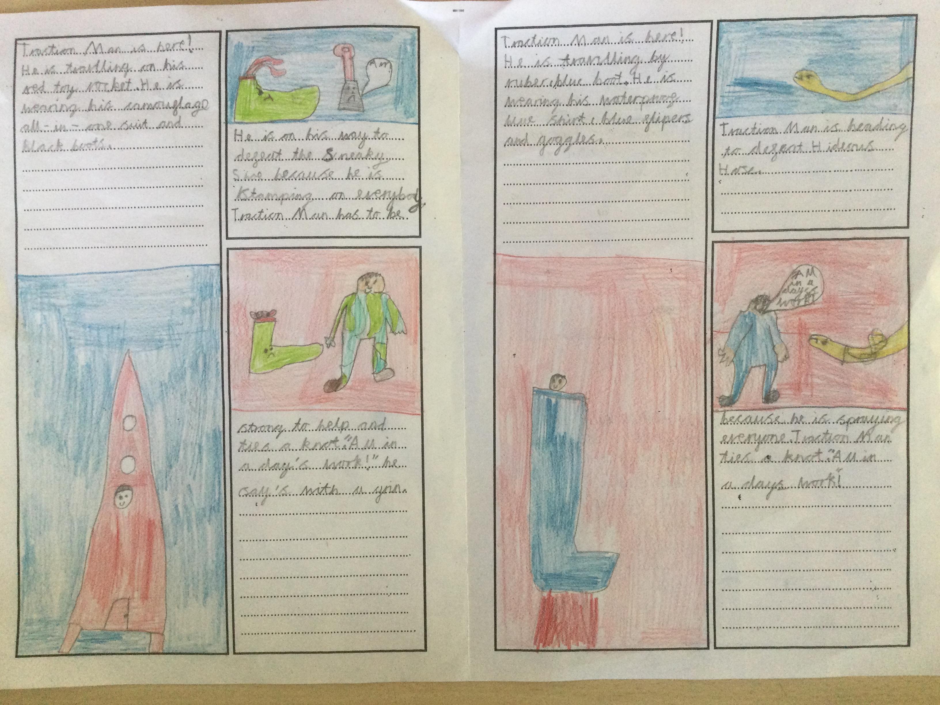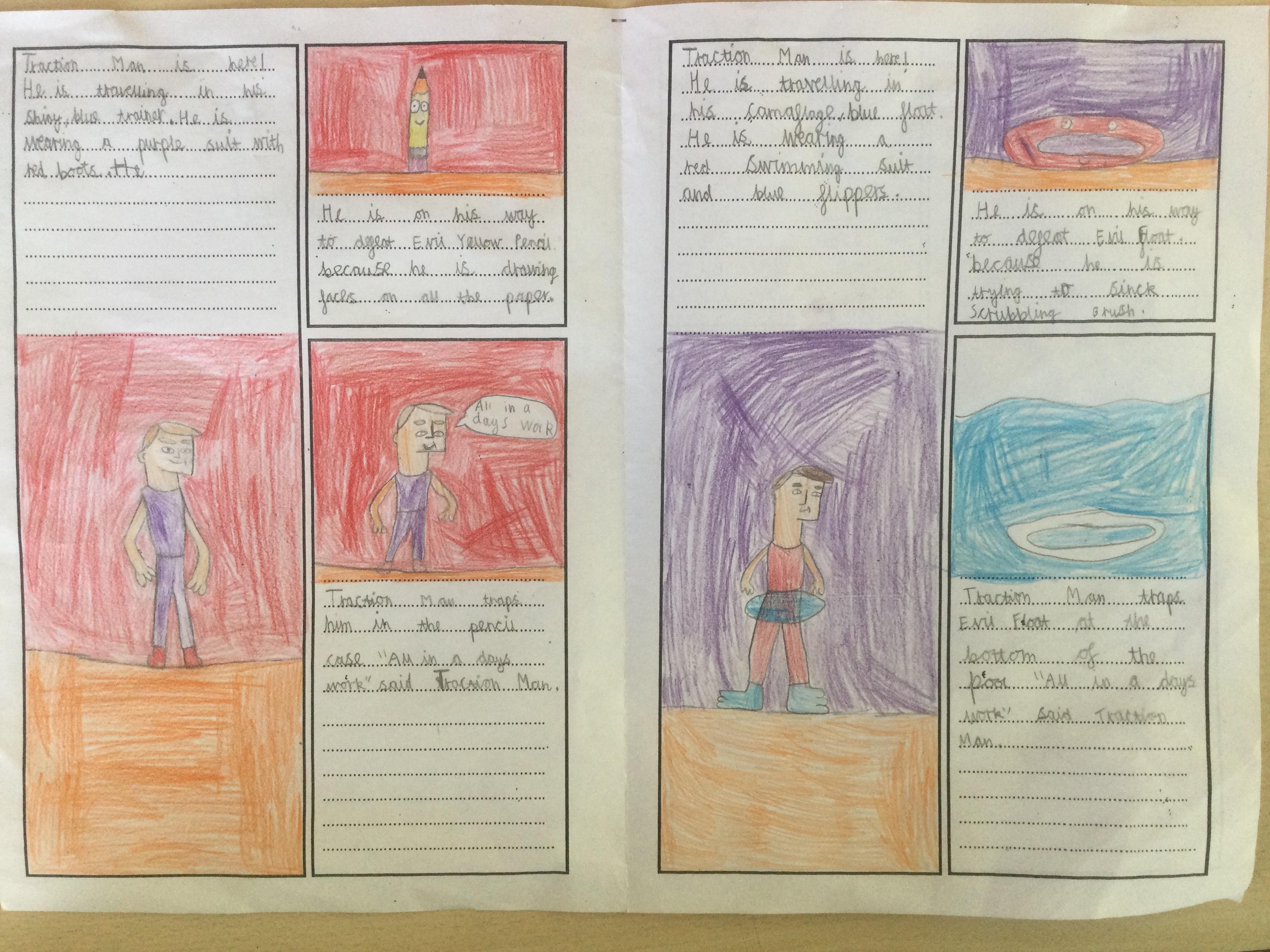 Using inspiration from the book 'Traction Man', Year 2 created their own Traction Man adventure books. They tried to use lots of description to make their stories engaging for the reader.