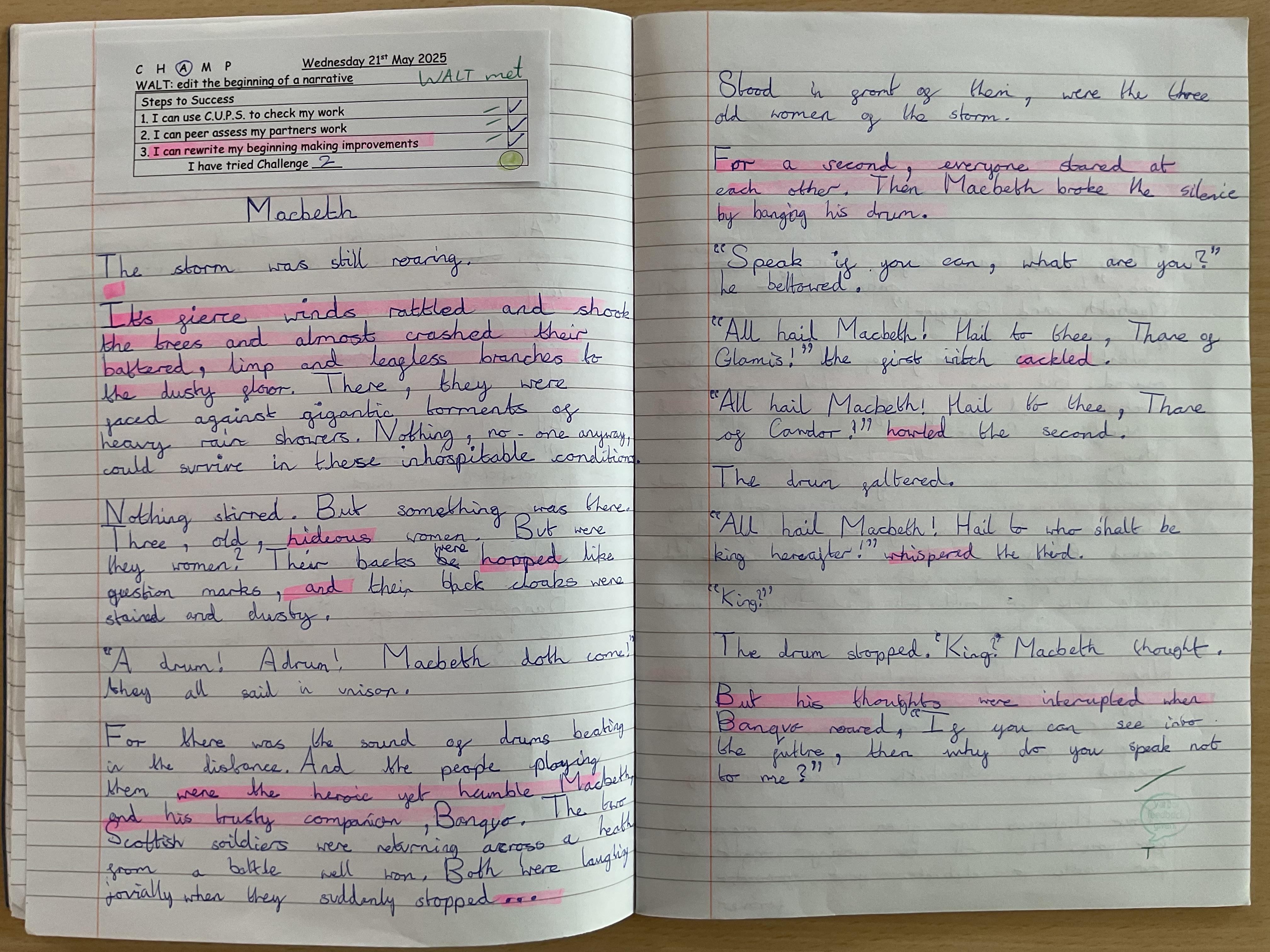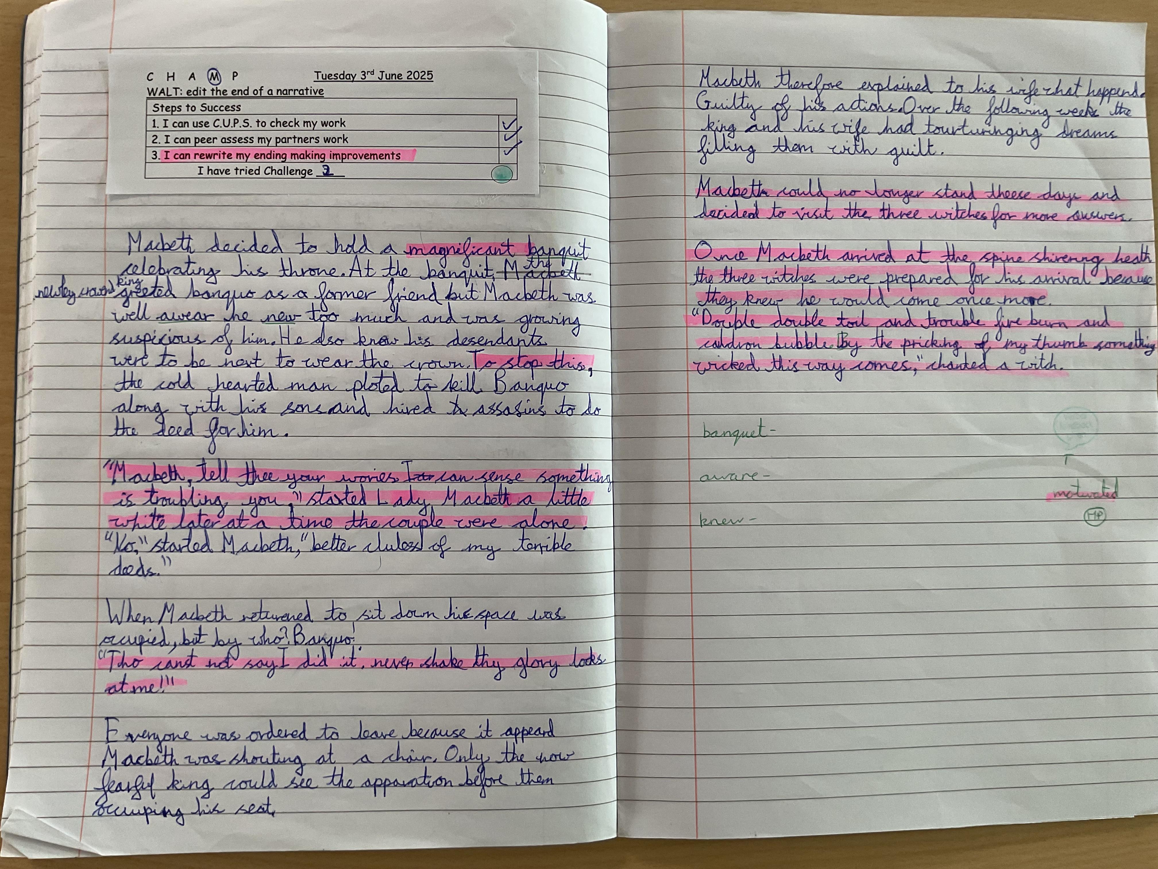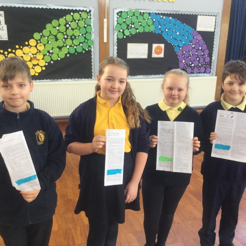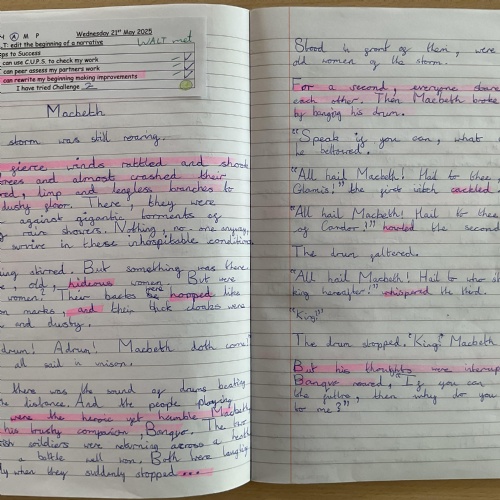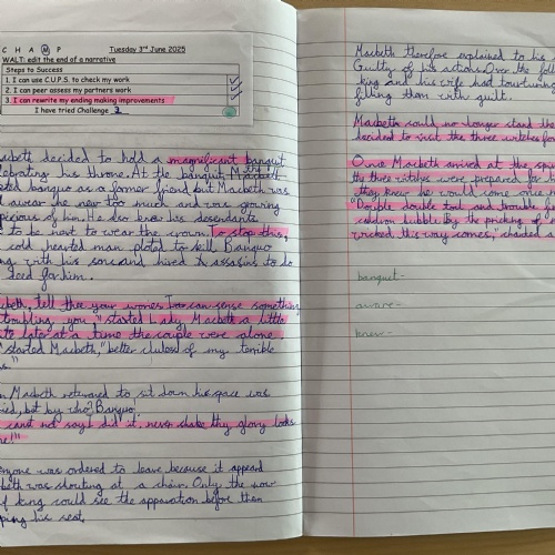 In Year 5 the pupils have been learning about Macbeth by William Shakespeare. We have written letters, held debates, use descriptive languages, acted some of it out and even written our own versions of the play.