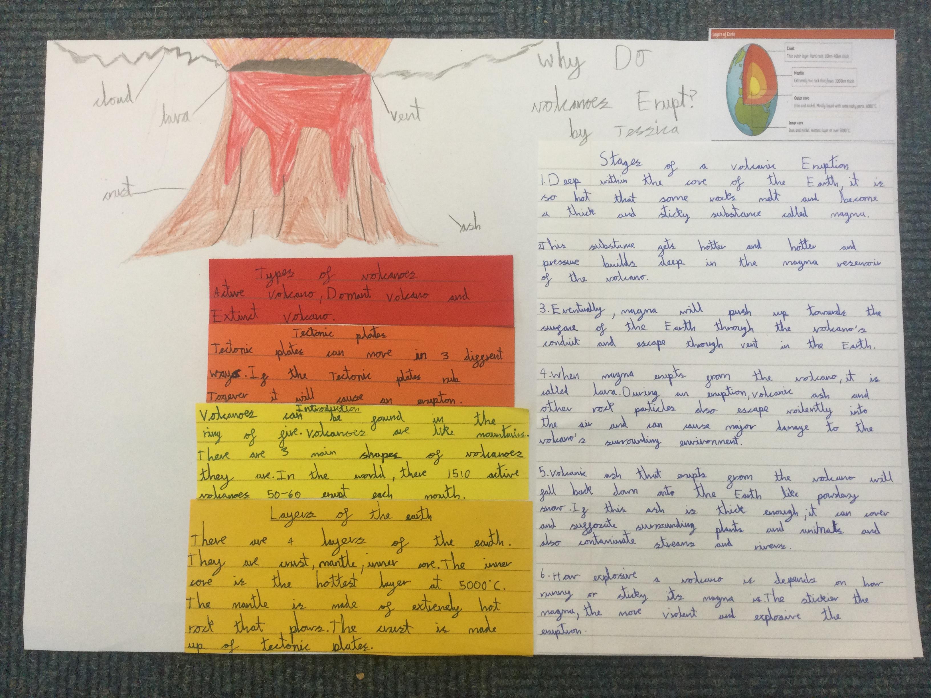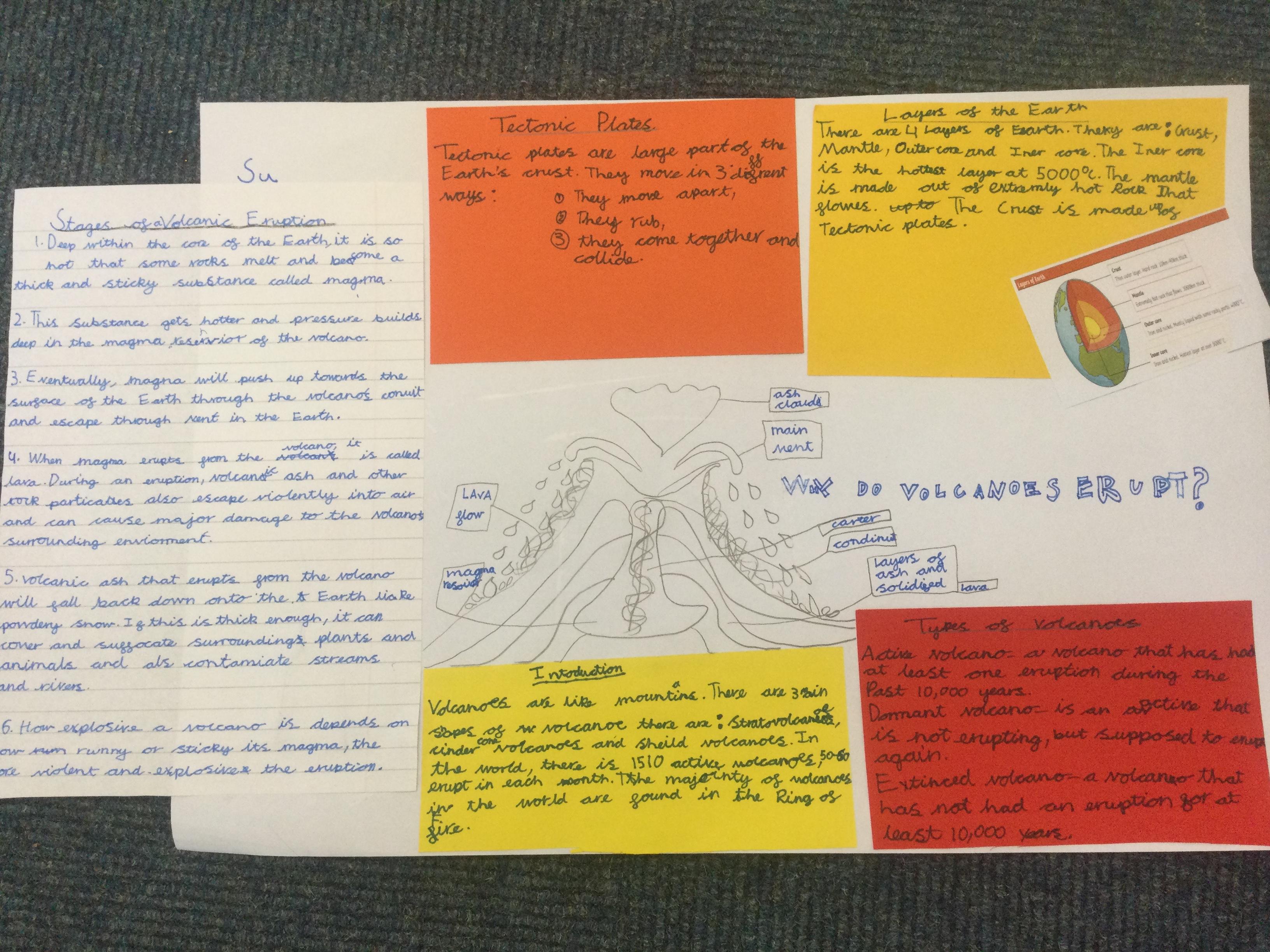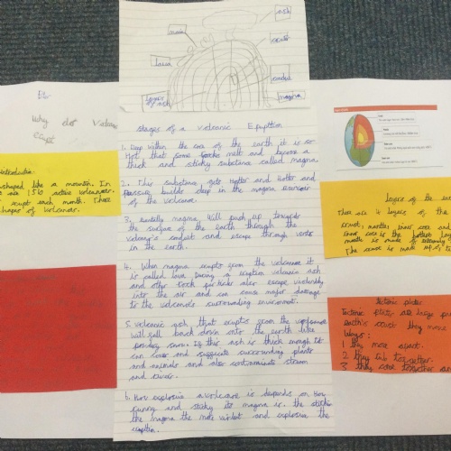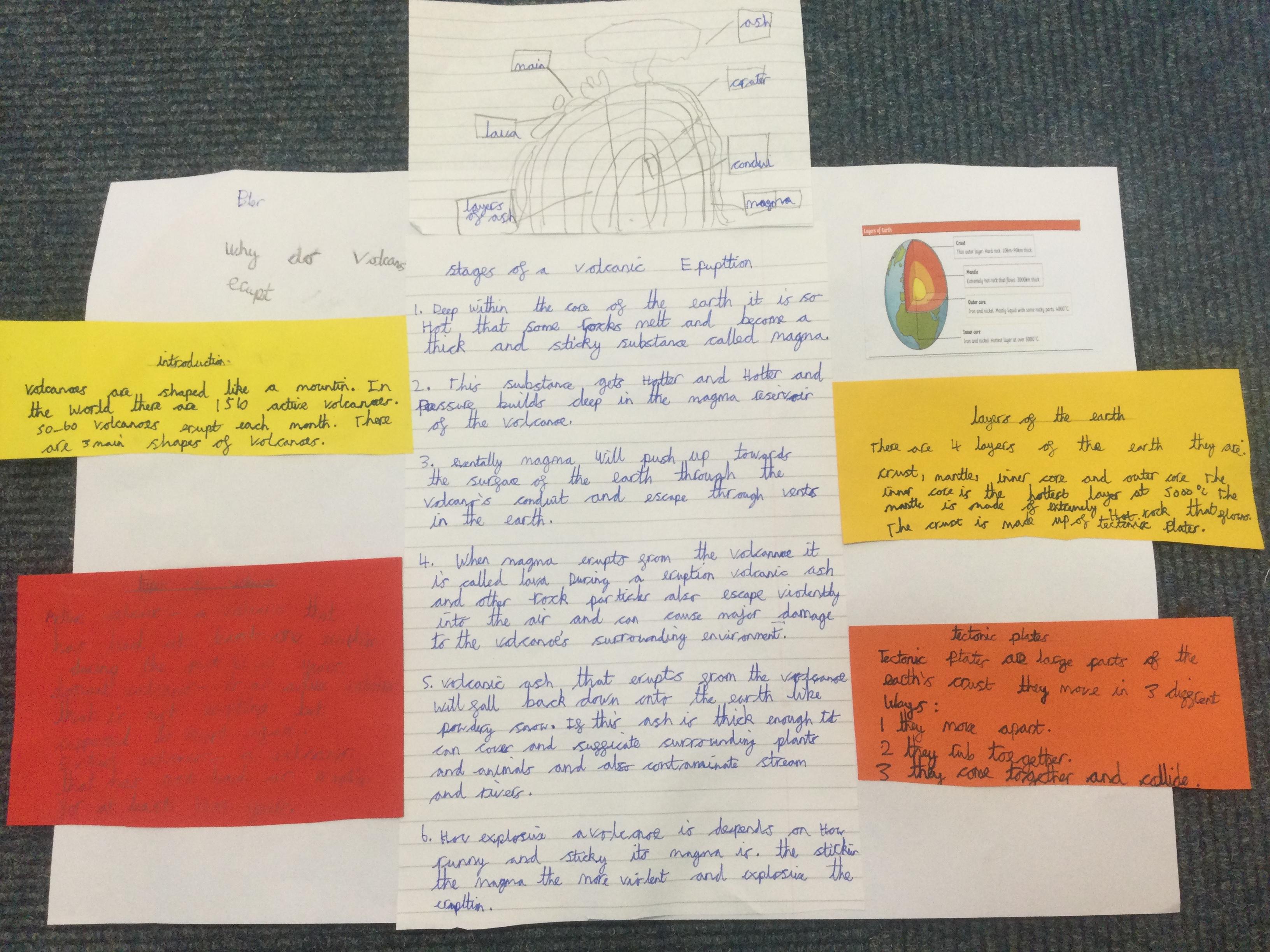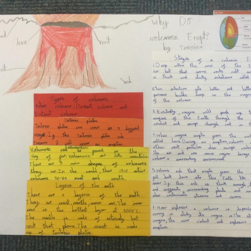 In Year 3, the pupils created their own explanation texts about volcanoes. They included all the key layout features including sub titles and diagrams. They tried to use lots of subject specific vocabulary and design a layout to interest the reader.