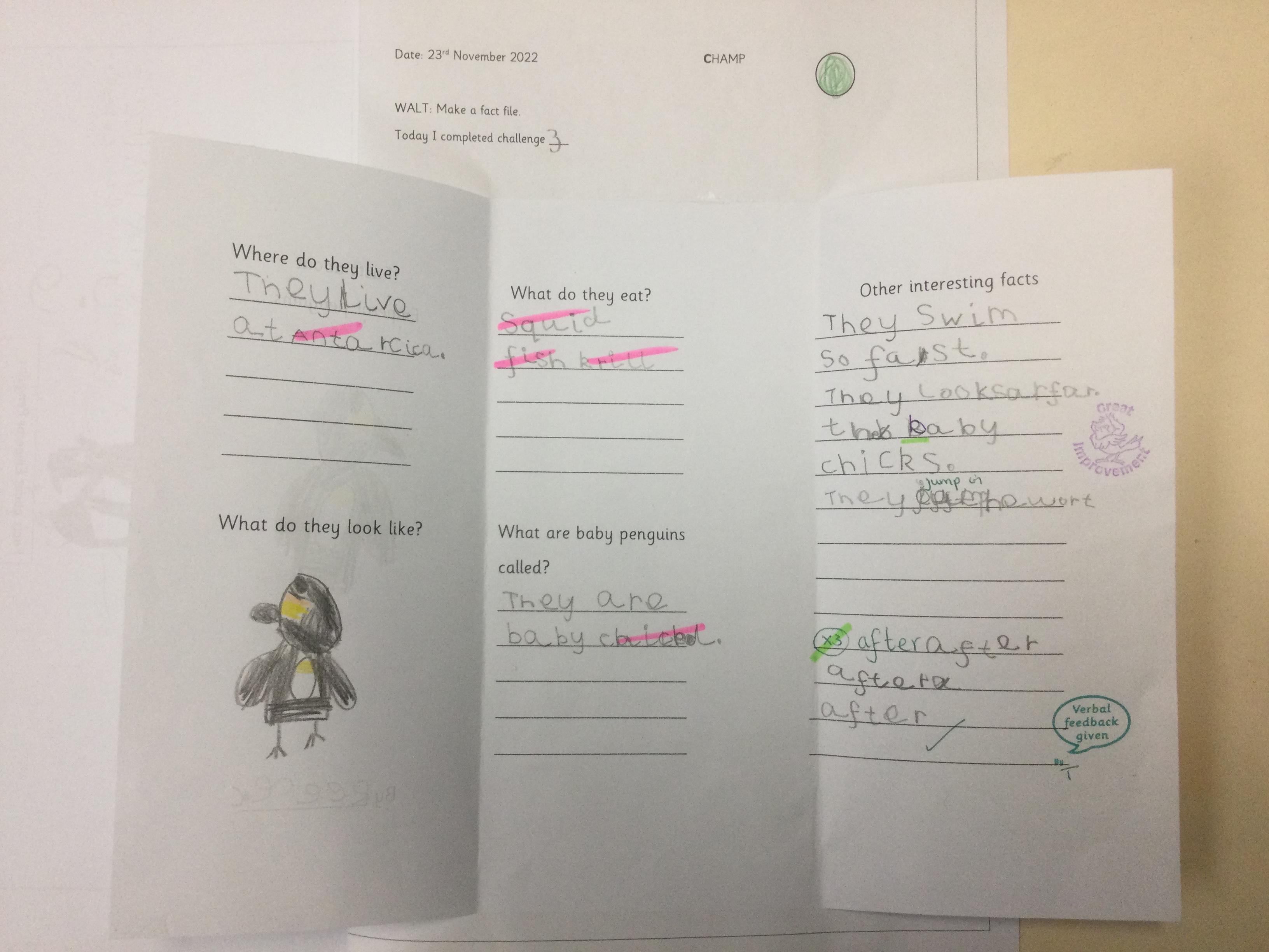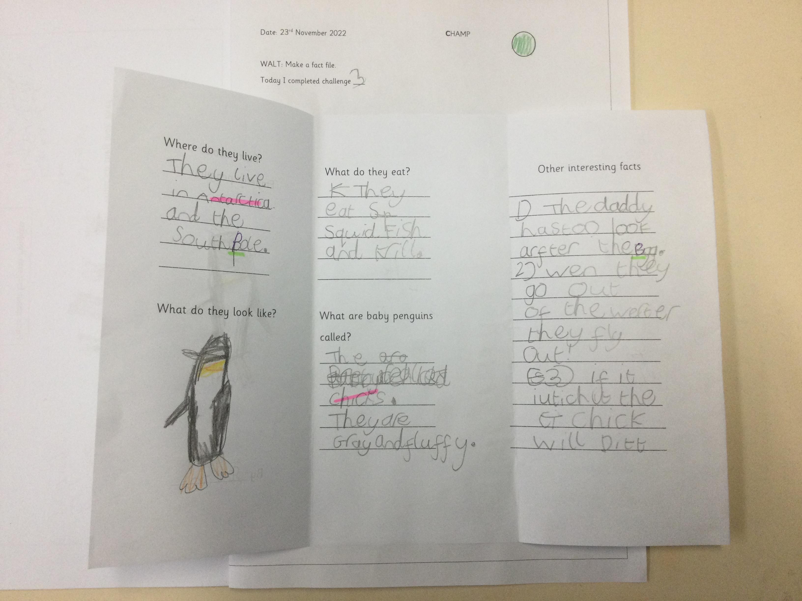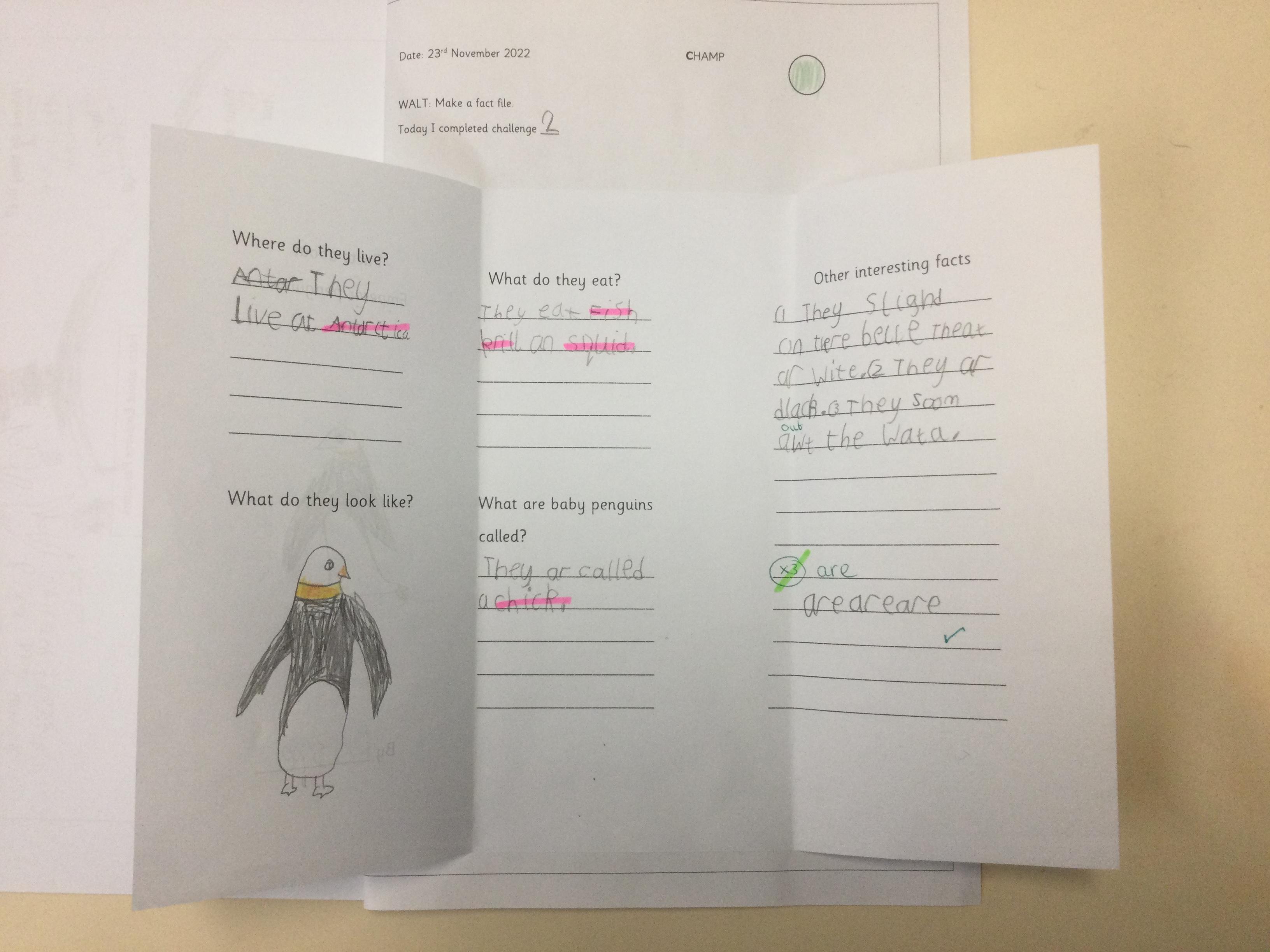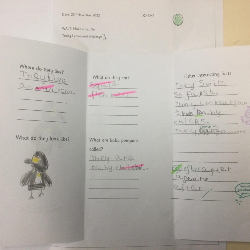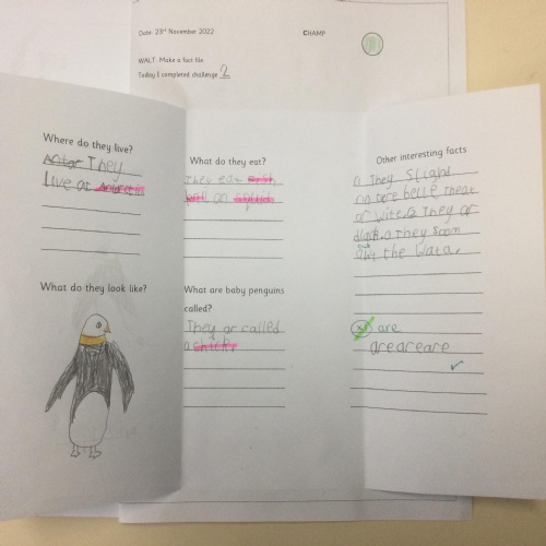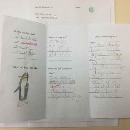 Year 1 found out about penguins and then wrote fact files about them. They included lots of interesting information.