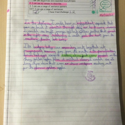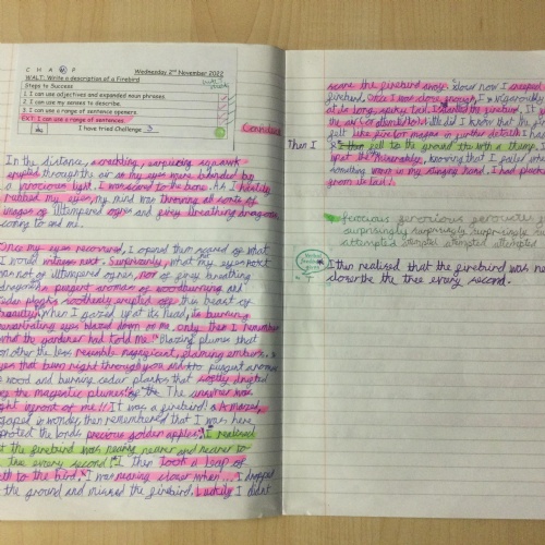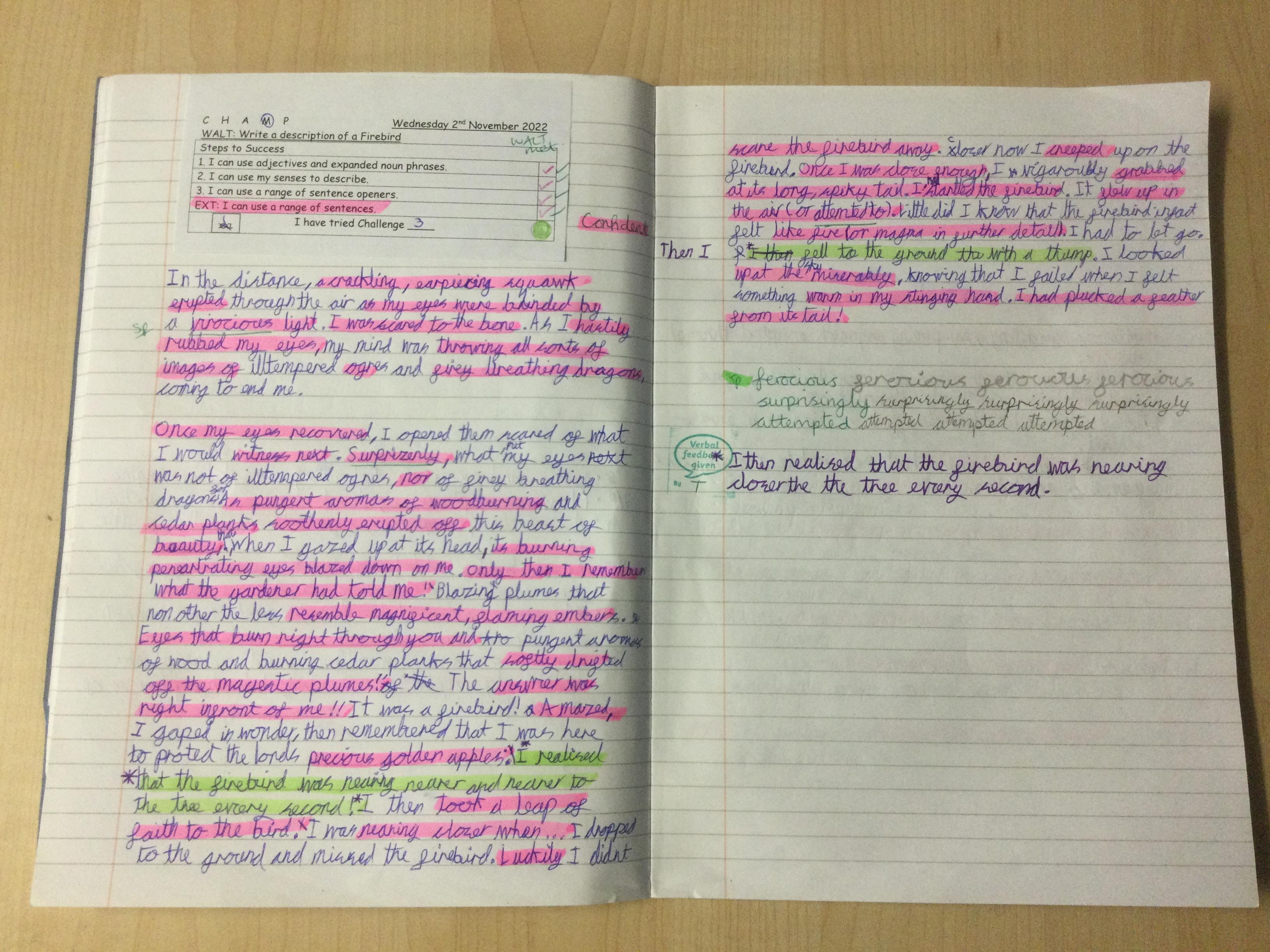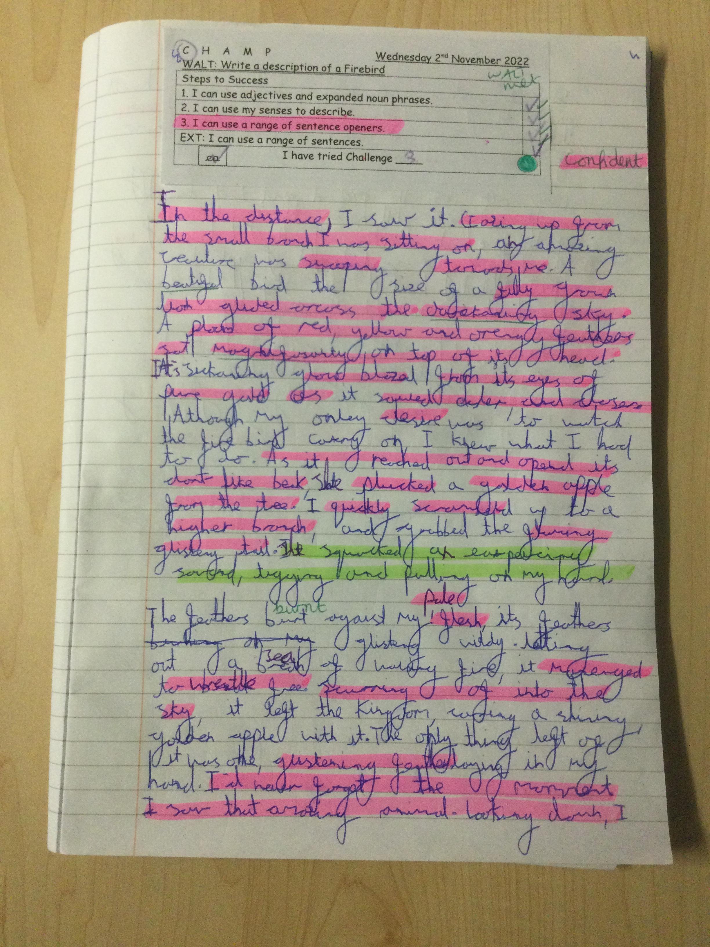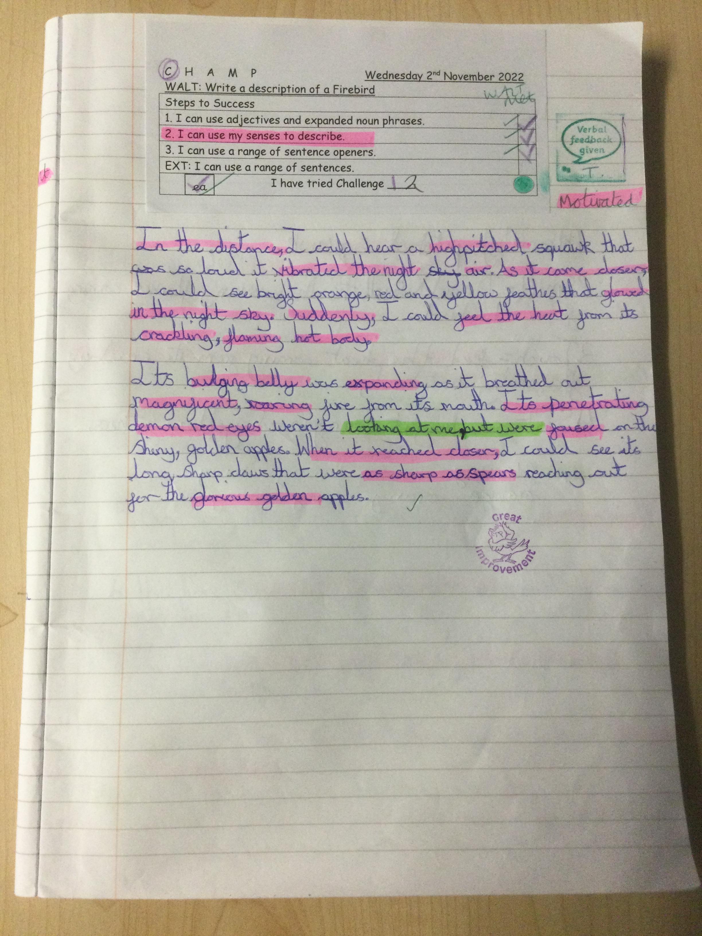 Year 5 wrote descriptions of the Firebird. They used their writing toolkits to help them include the features of descriptive writing.