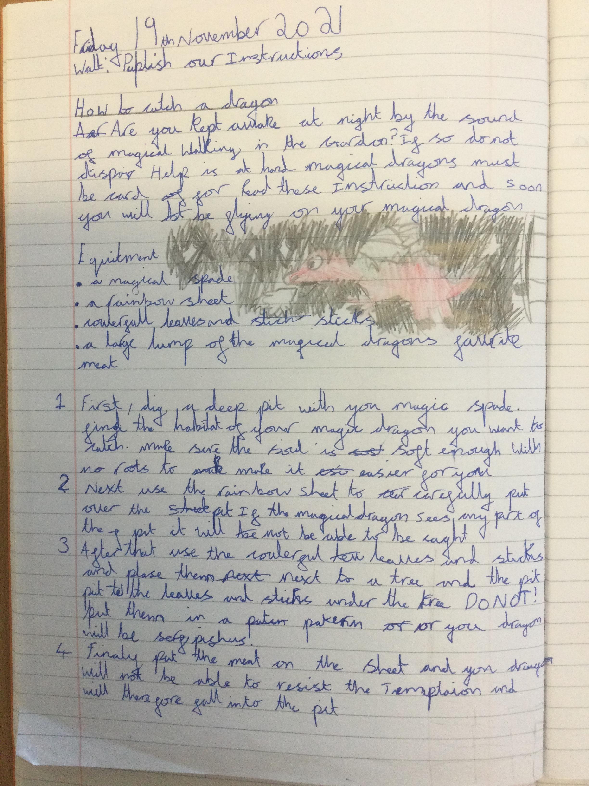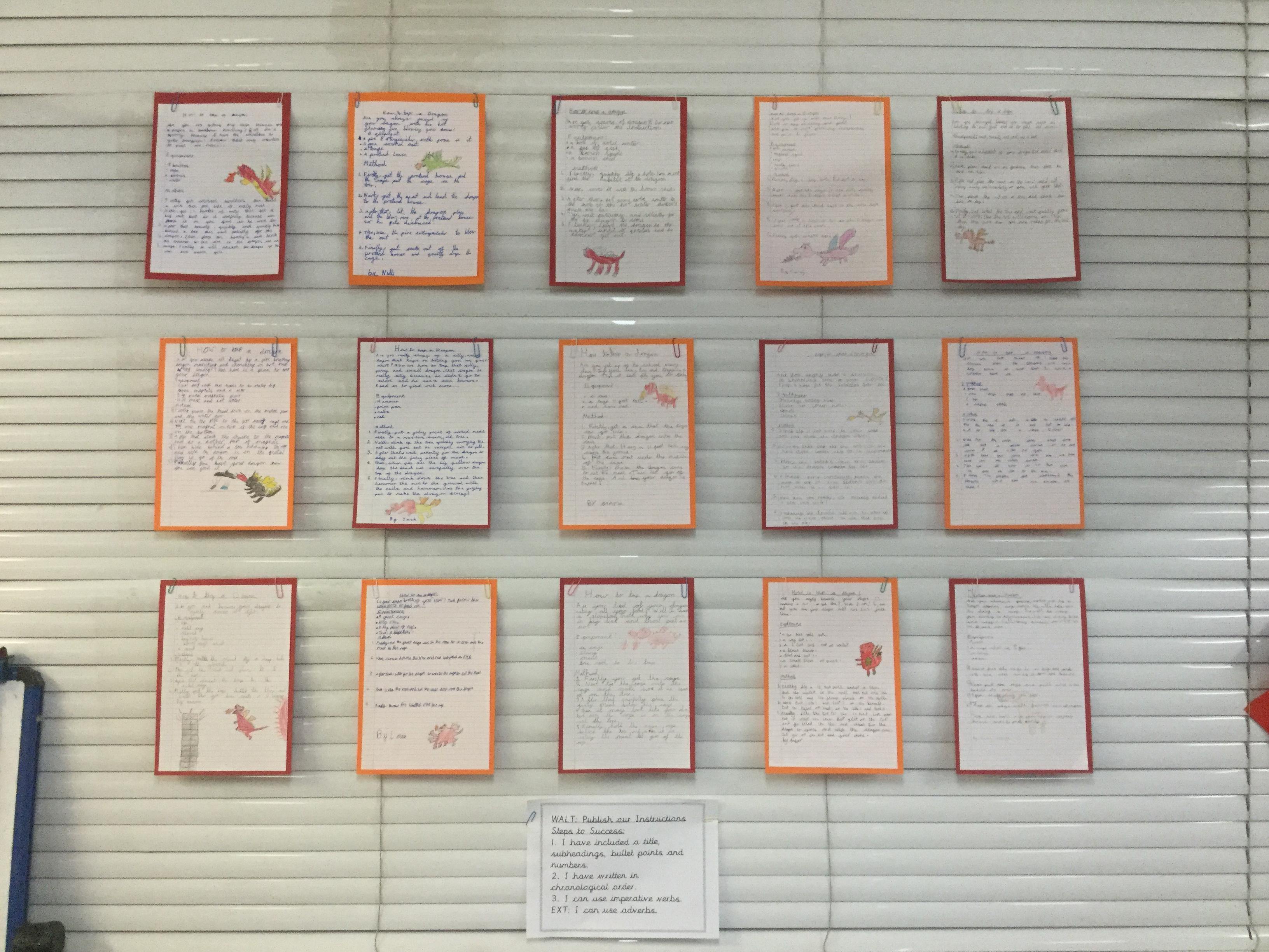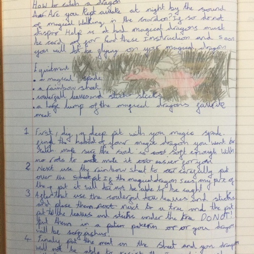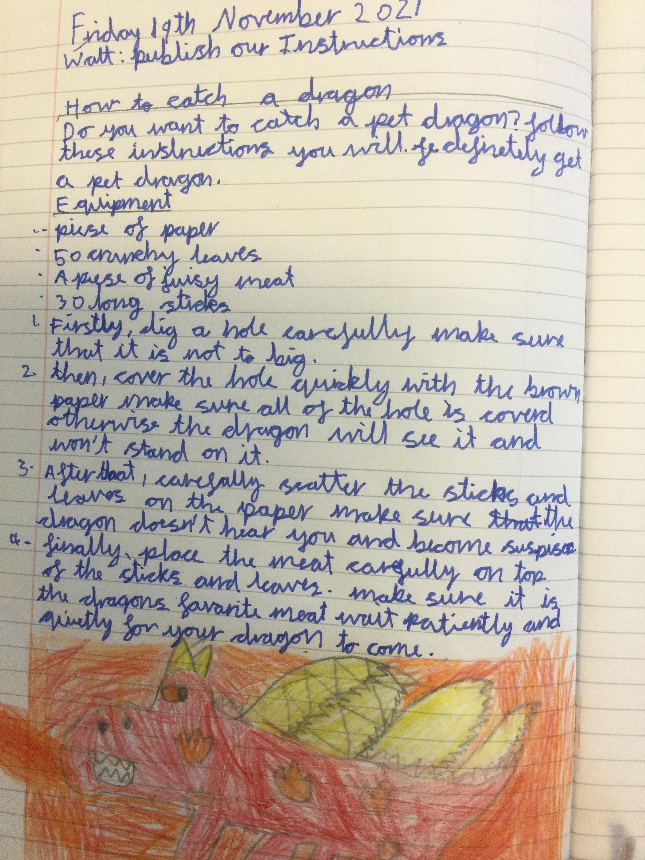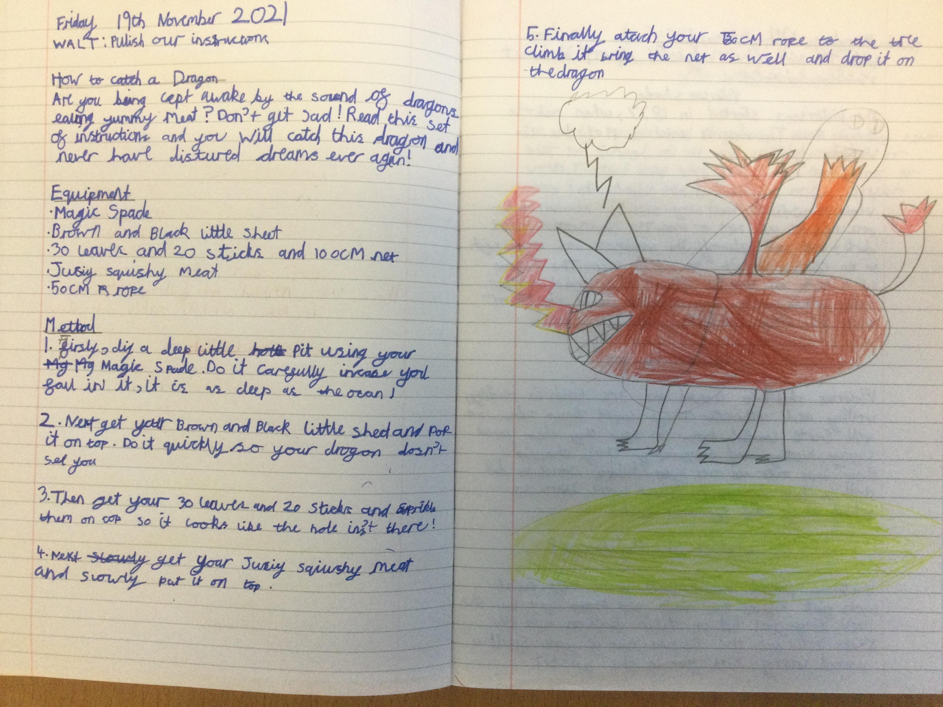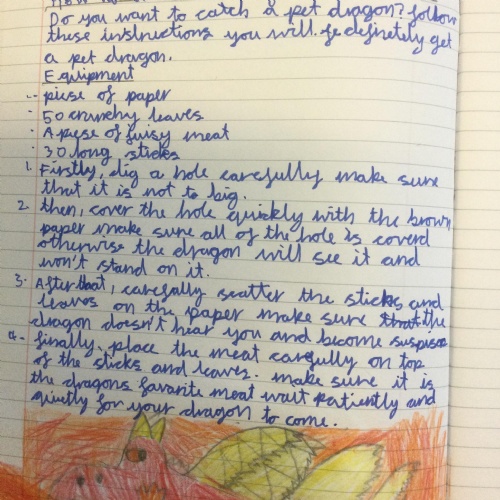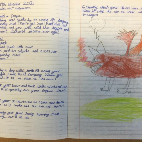 In Year 3, the pupils have been learning to write instructions on "How to Catch a Dragon". They had to include all the key features including: an introduction, imperative verbs, adverbs and time conjunctions.